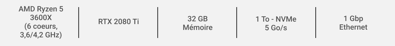 Stations 1 GPU Company Quantité * 1 2 3 4 5 Système Sans système Ubuntu 18.04 + Stack Windows 10 Processeur AMD Ryzen 5 3600X (6 coeurs, 3,6/4,2 GHz) AMD Ryzen 7 3700X (8 coeurs, 3,6/4,4 GHz) AMD Ryzen 7 3800X (8 coeurs, 3,9/4,5 GHz) AMD Ryzen 9 3900X (12 coeurs, 3,8/4,6 GHz) AMD Ryzen 9 3950X (16 coeurs, 3,5/4,7 GHz) Refroidissement Air Refroidissement liquide GPU RTX 2070 RTX 2080 Ti RTX Titan Mémoire 16 Go 32 Go 64 Go 128 Go Disque Système 1 To - NVMe 5 Go/s 2 To - NVMe 5 Go/s Disque Données Pas de disque 2 To - SSD 550 Mo/s 4 To - SSD 550 Mo/s Réseau 1 Gigabit Ethernet 10 Gigabit Ethernet Péripheriques Pas de périphérique Pack Clavier-souris filaire Pack Clavier-souris sans fil Écran Pas d'écran Écran 24 pouces Écran 27 pouces Garantie 2 ans - Pièces et MO 3 ans - Pièces et MO Livraison Emballage, livraison + assurance Total € Demander un devis Nom Prenom Email Commentaires/Demandes spécifiques